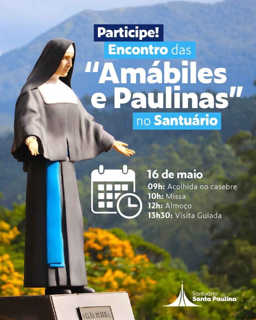 O Santuário Santa Paulina será cenário de um encontro marcado pela fé, gratidão e identidade espiritual no próximo dia 16 de maio. A arte divulgada convida para o “Encontro das Amábiles e Paulinas”, um momento especial pensado exclusivamente para pessoas que carregam esses nomes — seja por devoção, homenagem ou graças alcançadas.
