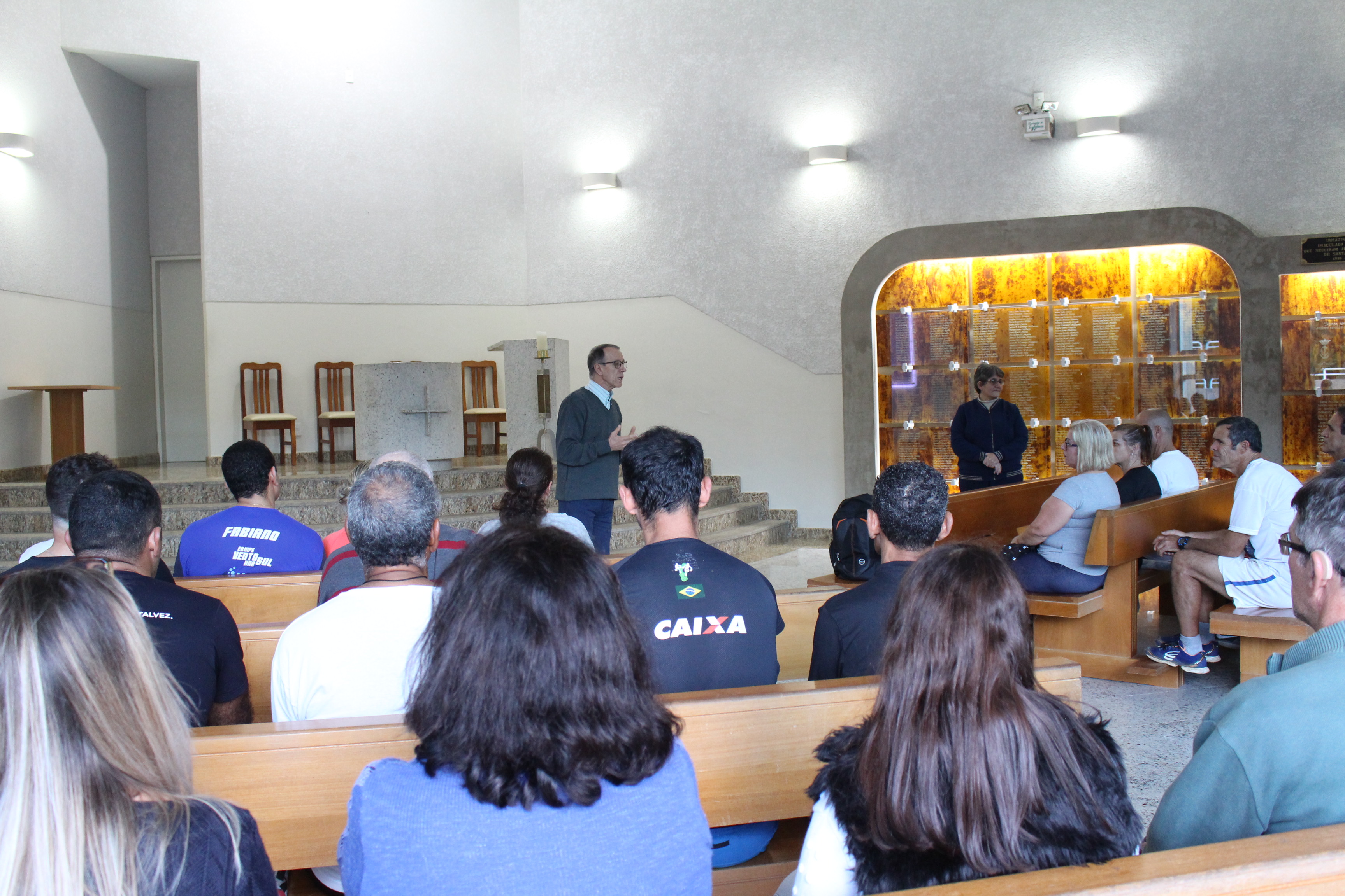 A recepção dos peregrinos aconteceu no Santuário, na Capela Santa Paulina pelo Reitor do Santuário, Pe. José Napoleão e também pela Ir. Luzia Cândido. Após a acolhida e uma reflexão realizada pelo Reitor os participantes realizaram uma homenagem ao idealizador e também para um amigo dos participantes que faleceu recentemente. O momento emocionou o grupo que recebeu uma benção especial.