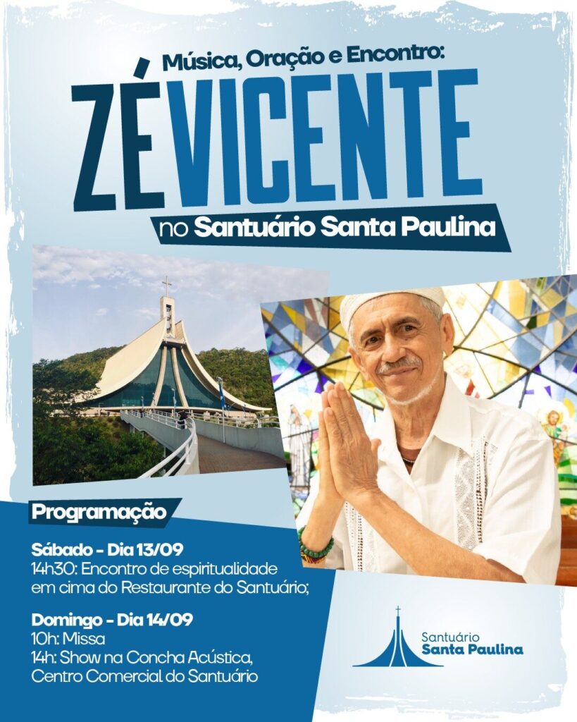 Prepare-se para um final de semana de fé e louvor no Santuário Santa Paulina! Nos dias 13 e 14 de setembro, o Santuário tem a honra de receber o cantor, missionário e poeta Zé Vicente. Conhecido por suas canções que tocam o coração e transmitem mensagens de esperança, Zé Vicente fará um encontro de espiritualidade profunda, uma experiência imperdível para todos os visitantes e fiéis de Santa Paulina.